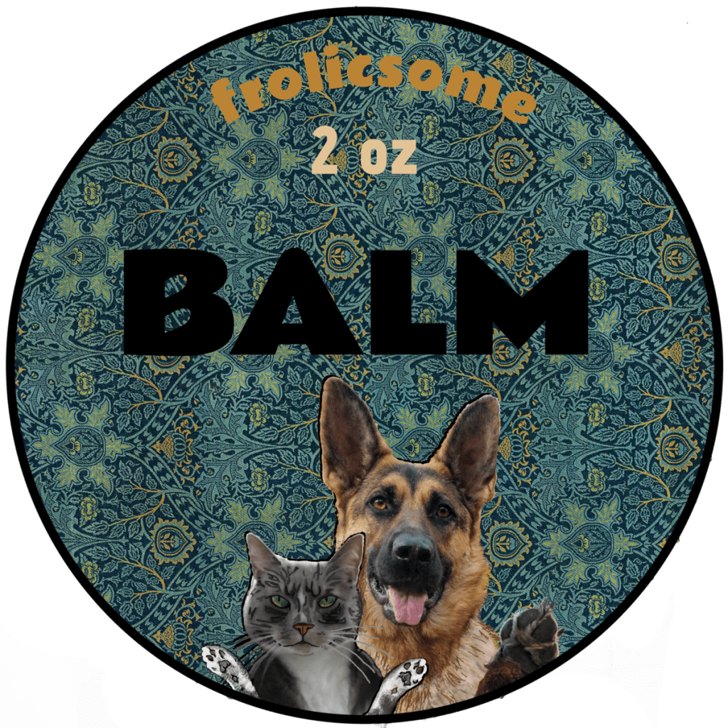 Frolicsome balm is safe for cats. The vets I have asked have said they see no reason why it can’t be used on other animals such as ferrets, bunnies, guinea pigs, horses, what-have-you, even on bird legs, but I have yet to find a vet who can tell me for certain that the specific ingredients are documented as safe for any other animals. I’m still looking for that verification. I have researched carefully to make sure my balms are safe for dogs and cats.